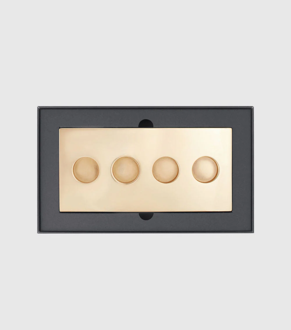 This limited edition gold tray is a collaboration with Skultuna, the Swedish luxury heritage brand known for its exquisite craftsmanship. Playfully named after the country's Guldbaggen award, which is the equivalent of a Hollywood Oscar. Each contains a quartet of custom sized locators made to fit our signature makeup sticks.